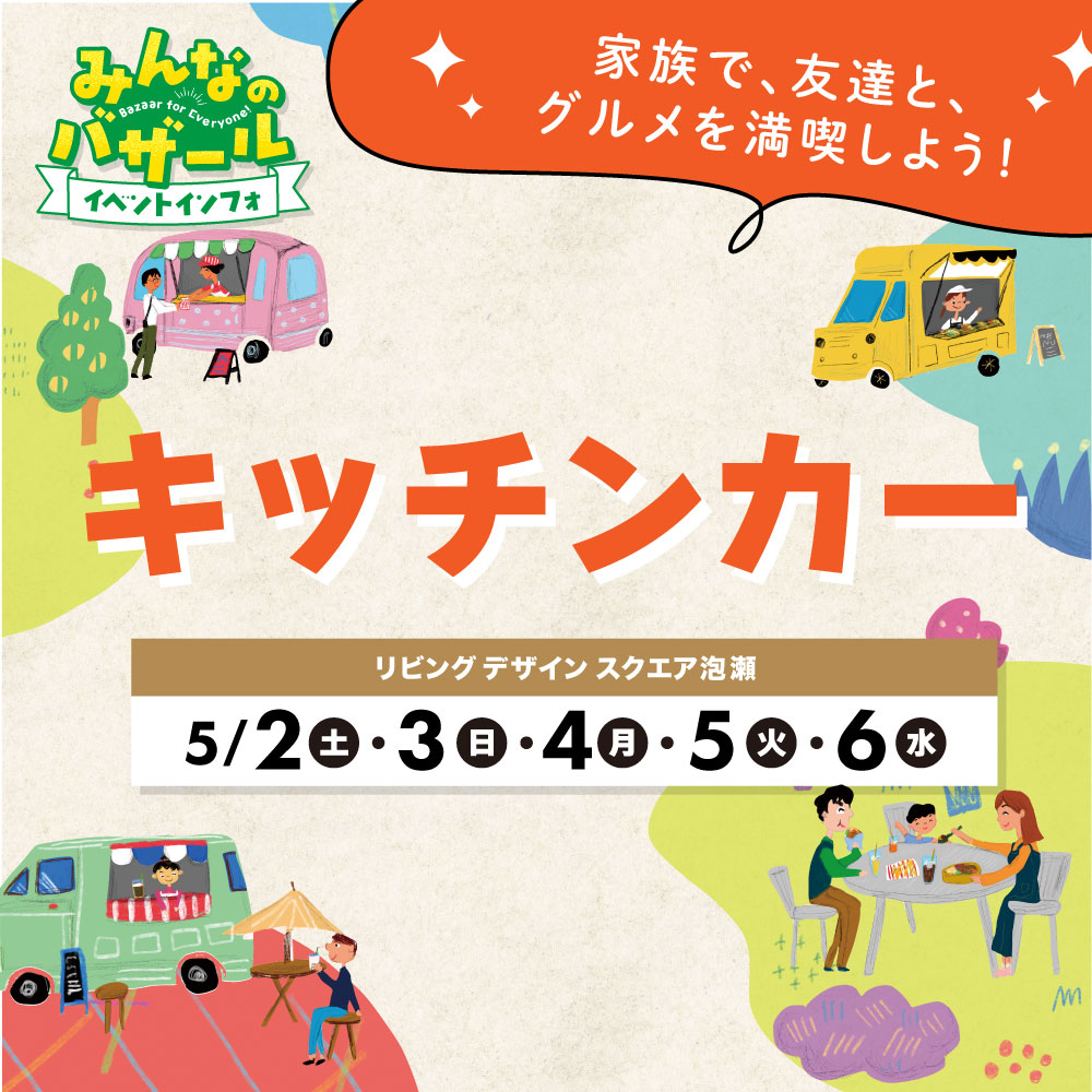 2026.04.15 (日本語) みんバザ キッチンカー EVENT (日本語) 2026.5.2(土)~5/6(水) (日本語) みんバザ キッチンカー Sorry, this entry is only available in 日本語. (日本語) GW キッチンカー 2026.5.2(土)~6(水) 家族みんなで 場所:リビングデザインスクエア泡瀬 他にも+(プラス)な情報をCHECK☆